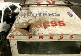 PowerLine analysed the alleged missile attack on a Reuters Land Rover. As in the ambulance story, the damage shown was not consistent with a missile strike (concrete block perhaps?) This story also produced the victim with a blood soaked shirt and pristine undershirt.