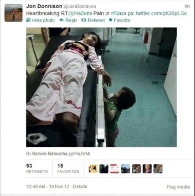 Jon Donnison knowingly forwarded a tweet with a picture of A victim of Assad in Syria as one of a victim of Israel in Gaza, with the comment "Heartbreaking."