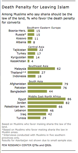 In multiple Muslim nations, overwhelming majorities of Muslims support the death penalty for apostasy or blasphemy.