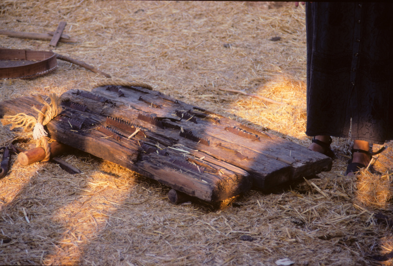 A threshing sled (upturned) at Neot Kedumim. A wooden sled with iron teeth on the underside.