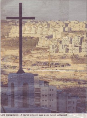 “Land Expropriation – A church looks out over a new Israeli settlement."