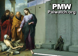 Finally Murillo's Christ healing the Paralytic at the Pool of Bethesda, (1670), in which Christ is depicted curing a suffering man near the pool, the scenery of the healing pool has been replaced by a photo of a Palestinian sitting by Israel's separation wall. Produced for the Pope's visit to Bethlehem; along with other corruptions of great art. |