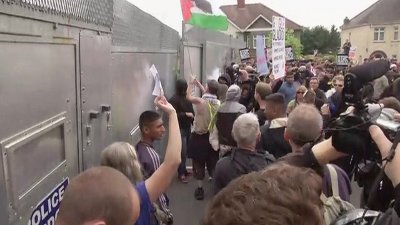 Wales (UK) 20km of fencing, 9foot/2M high, around the Celtic Manor venue and key venues in Cardiff. for a NATO summit. (Sept 2014) Notice the flag? |