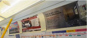Anti-Israel activists took over the advertising space on London Underground trains with their propaganda material (22 February 2016) The Mayor of London was informed and took steps to have them all removed. Note the sophistication of the poster production - to a high quality, and exact size to fit the location.