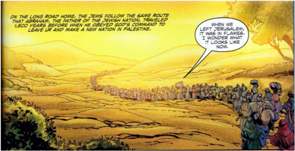 Look carefully at the block of text at the top of this plate from The Action Bible, recounting the story of the return from the Babylonian exile with Nehemiah. "... THE JEWS FOLLOW THE SAME ROUTE THAT ABRAHAM ...WHEN HE OBEYED GOD'S COMMAND TO LEAVE UR AND MAKE A NEW NATION IN PALESTINE" You and I may know that the name "Palestine" was not coined by the Romans until 135CE but the young readers of the Action Bible will buy into the post 1967 Palestinian fiction that there has been a nation of Palestine since Before the time of Abraham. Notice also how the error/lie has crept from an appendix, as the maps above, into the body of what purports to be the Bible!