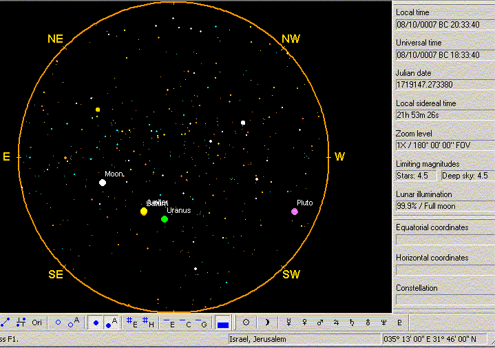 If you look for the likely date of Sukkot in 7BCE (speculating, since we only know Jesus was born before zero AD) using a computer simulation (www.cybersky.com) you will get a picture like this. It shows the necessary full moon and the conjunction of Jupiter and Saturn, which would have been very bright (being full moon). We know this conjunction would have been deemed significant by the magi. You will also notice that it is slightly east of south (at this time of night), seen from Jerusalem. Remember the magi went to Jerusalem and enquired for the newborn king of the Jews and followed the star from there to Bethlehem (to the South). Just thought you might find this interesting.